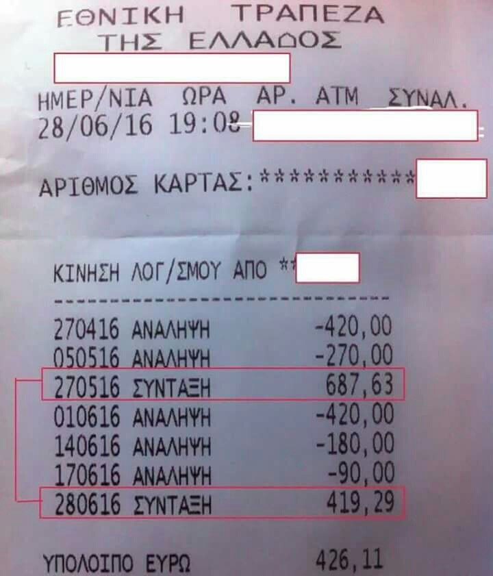 Ενδεικτκή είναι η απόδειξη από την κίνηση λογαριασμού συνταξιούχου με ημερομηνία 28/06/16 και ώρα 19.08 από την οποία προκύπτουν τα εξής: